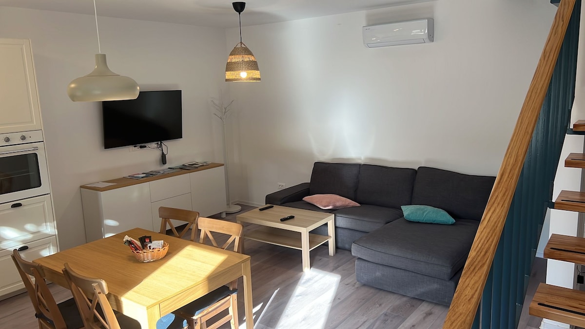Modern Apartment in Trogir’s Heart This stylish apartment is perfect for up to 4 guests, located just steps from Trogir’s main square and waterfront. It features a cozy bedroom with a double bed and en-suite bathroom, a second bathroom with a shower and washing machine, a fully equipped kitchen with a dishwasher, and a comfortable living room with a sofa bed. Enjoy the convenience of nearby restaurants, bars, and shops, all within walking distance.
