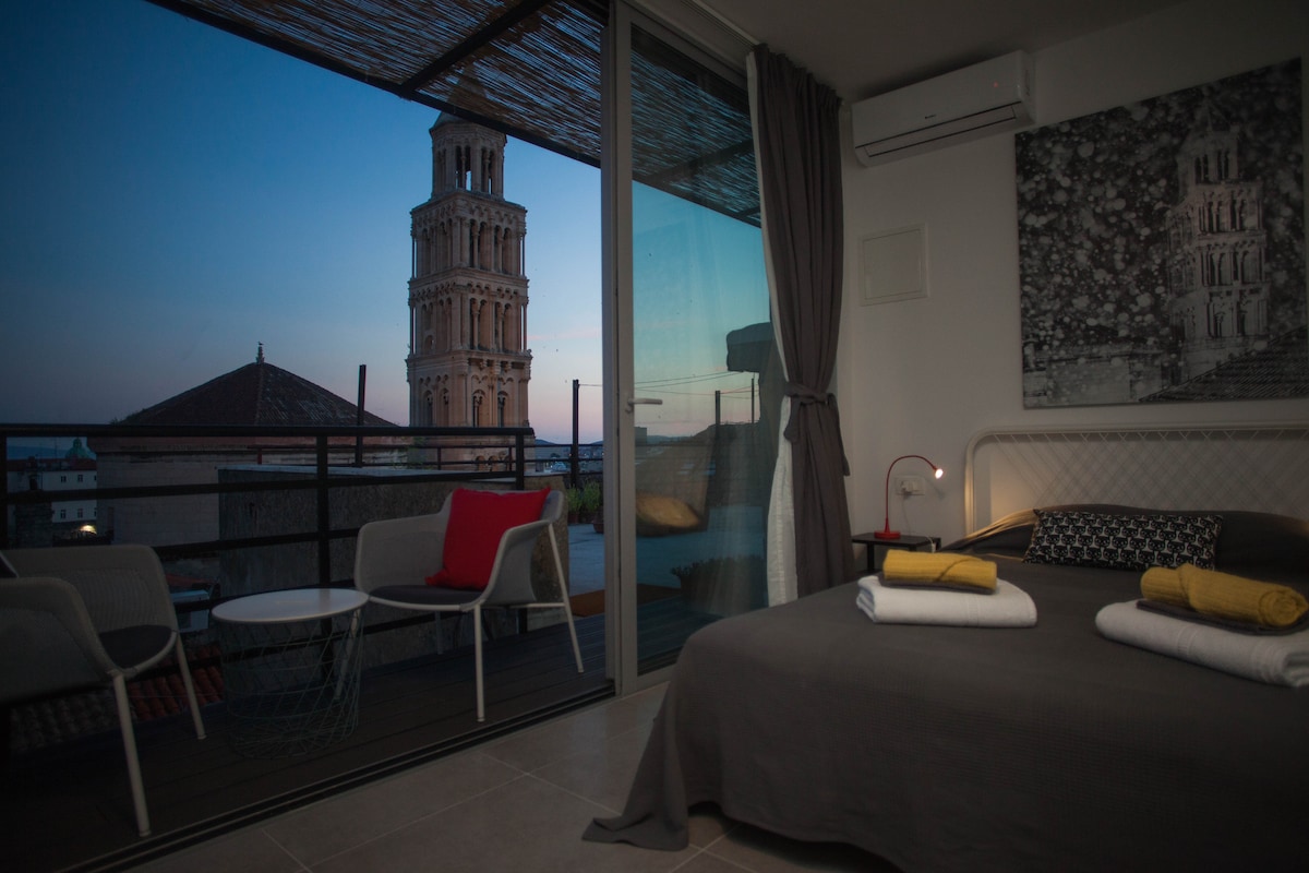 Trevor's review : " The central location and the stunning view is matched by the modern space that has been created. You walk out onto the roof top to the see main central tower that is St. Domnius in front of you! The apartments main wall is all glass, that can slide back to open the whole space up. Photos do not explain how brilliant this place is. A modern space, very comfortable bed, air con, fridge, smartTV and coffee machine. Large shower room off main space."...