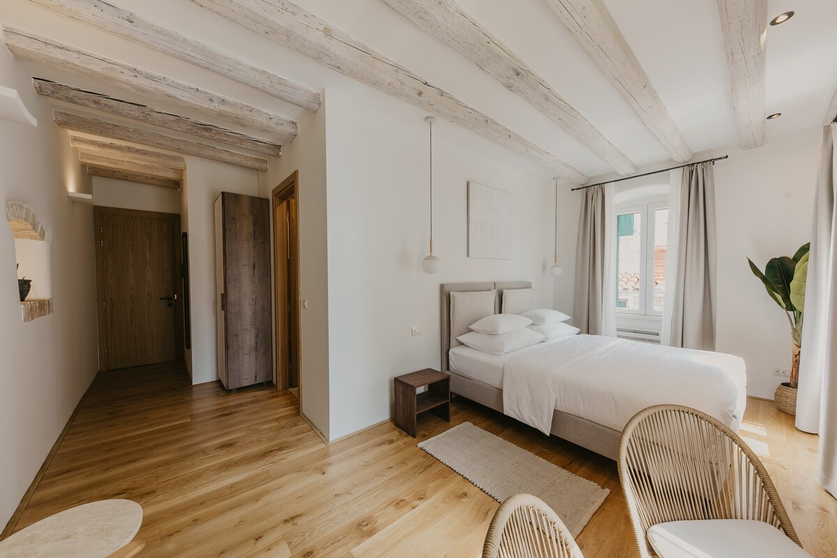 Bright, airy, Mediterranean style. This large room (27sqm/290 s.ft.) shines with a 19th-century exposed stone wall and exposed solid-wood beams. Natural materials merge with a smoothing color palette and a collection of rustic and modern furniture. Wide windows with a city view overlook a pedestrian street in Split’s Old Town. You are in the heart of Split, right next to Riva waterfront promenade and surrounded by all main attractions, restaurants and café-bars. Part of Porto Nativo Split.