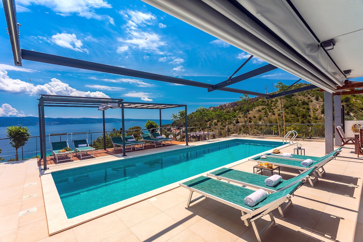 Moderna luksuzna vila s pogledom na more u blizini Splita. Vila je opremljena prekrasnim i sofisticiranim namještajem, saunom i teretanom. Iz vile se pruža prekrasan pogled na more. Lokacija vile je između prekrasnih gradova Splita i Trogira. U prizemlju ćete pronaći modernu kuhinju, otvoreni dnevni boravak, saunu, teretanu i toalet za goste. Na prvom katu nalazi se 5 spavaćih soba s vlastitom kupaonicom. Vanjski prostor čine bazen, terasa s ležaljkama i blagavaonica na otvorenom.