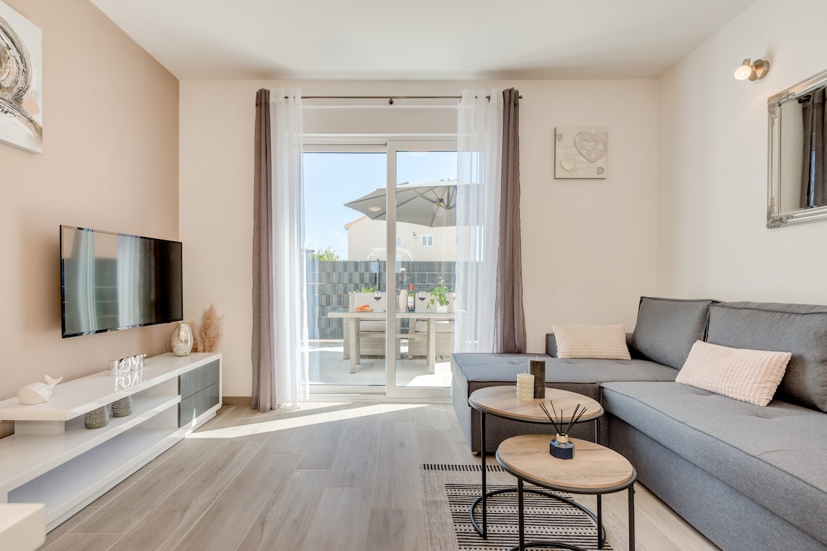 La vie est belle is new, modern and luxury apartment located only 3 minutes away walking from historical UNESCO old town Trogir. Has 54m2 and 30 m2 garden where you can enjoy in barbecue facilities. Comes with two bedrooms, a living room, bathroom, a fully equipped kitchen with a dining area,flat-screen TV in every room and free Wi-fi.Offers free parking spot. All atractions are near by. Split airport is only 5 km (or 9 minutes away).Beach is 7 minutes away. Baotić Marina is 7 min away by car.