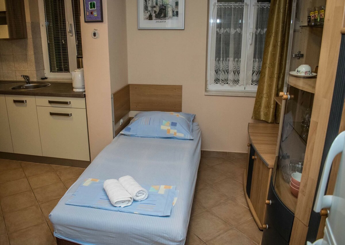 Cozy studio with a stunning sea view with shared terrace. Located by the beach, just 2 km from Trogir, this small but fully equipped studio is a great base for your vacation in central Dalmatia. A beautiful pebble beach is right across the street — just a few steps away. The terrace is shared between two studios, with a designated area in front of each for private use. Please note that during peak season, street parking can be difficult to find, even further from the house.