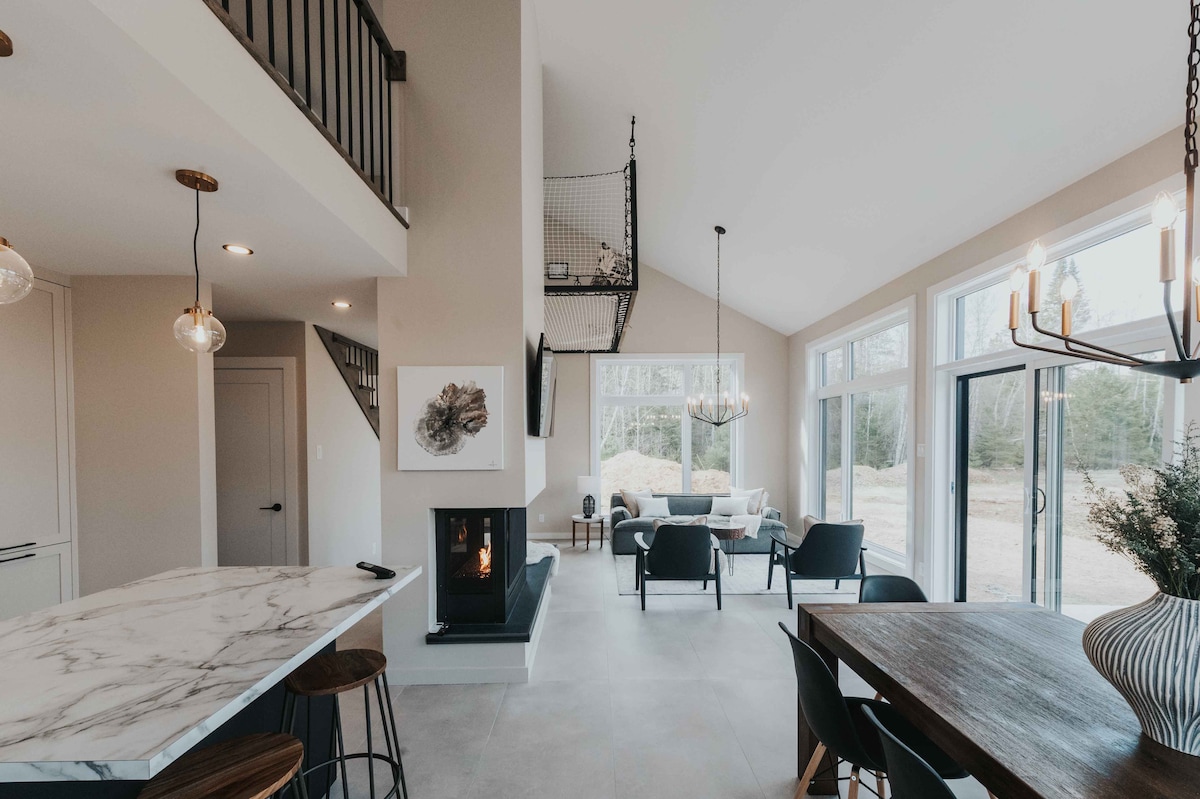 Chalet en bordure de la rivière Saint-Maurice, admirez la rivière par sa grande fenestration, Situer sur un domaine privé de 130 hectares, confort chaleureux, poêle au bois dans l'aire ouverte, planchers chauffants, 2 thermopompes, 3 chambres, 1 salle de bain, 4 lits très confortables et au sous sol, des jeux sur table et un téléviseur avec plusieurs DVD. Sur le domaine plusieurs activités, allez voir les Alpagas, les chevaux, accès à une plage privée, sentier 5 km, 2 chutes et une cascade ect