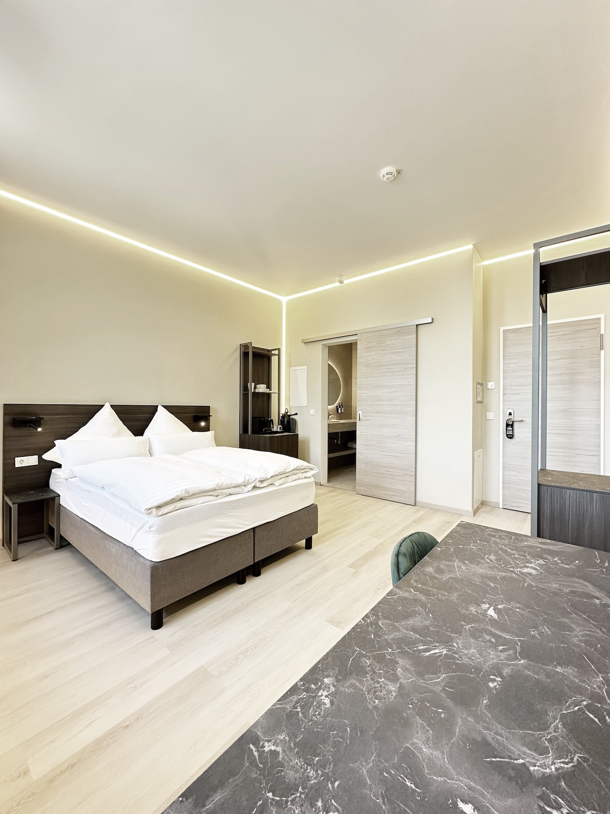 The rooms at Urban Loft Cologne are sleek, modern, and thoughtfully designed for comfort and functionality. Featuring minimalist industrial decor, each room includes a plush bed with high-quality linens, a spacious rain shower, smart TV, air conditioning, and soundproof windows. Natural light, sustainable amenities, and curated local artwork add a warm, personal touch—making every stay both relaxing and inspiring.