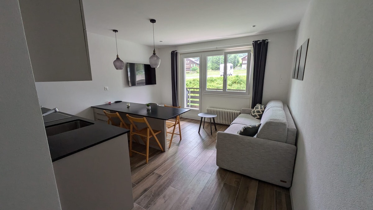 This charming studio, nestled in a peaceful building in the heart of Morgins, is just a few steps from the cable cars leading to the magnificent Portes du Soleil ski area. Thoughtfully designed and comfortable, it features a balcony where you can enjoy the fresh mountain air, as well as a convenient storage room for your ski equipment. In summer, hiking trails and mountain bike routes are right on your doorstep. A fully equipped kitchen and sofa beds ensure a stay with all the comforts you need.