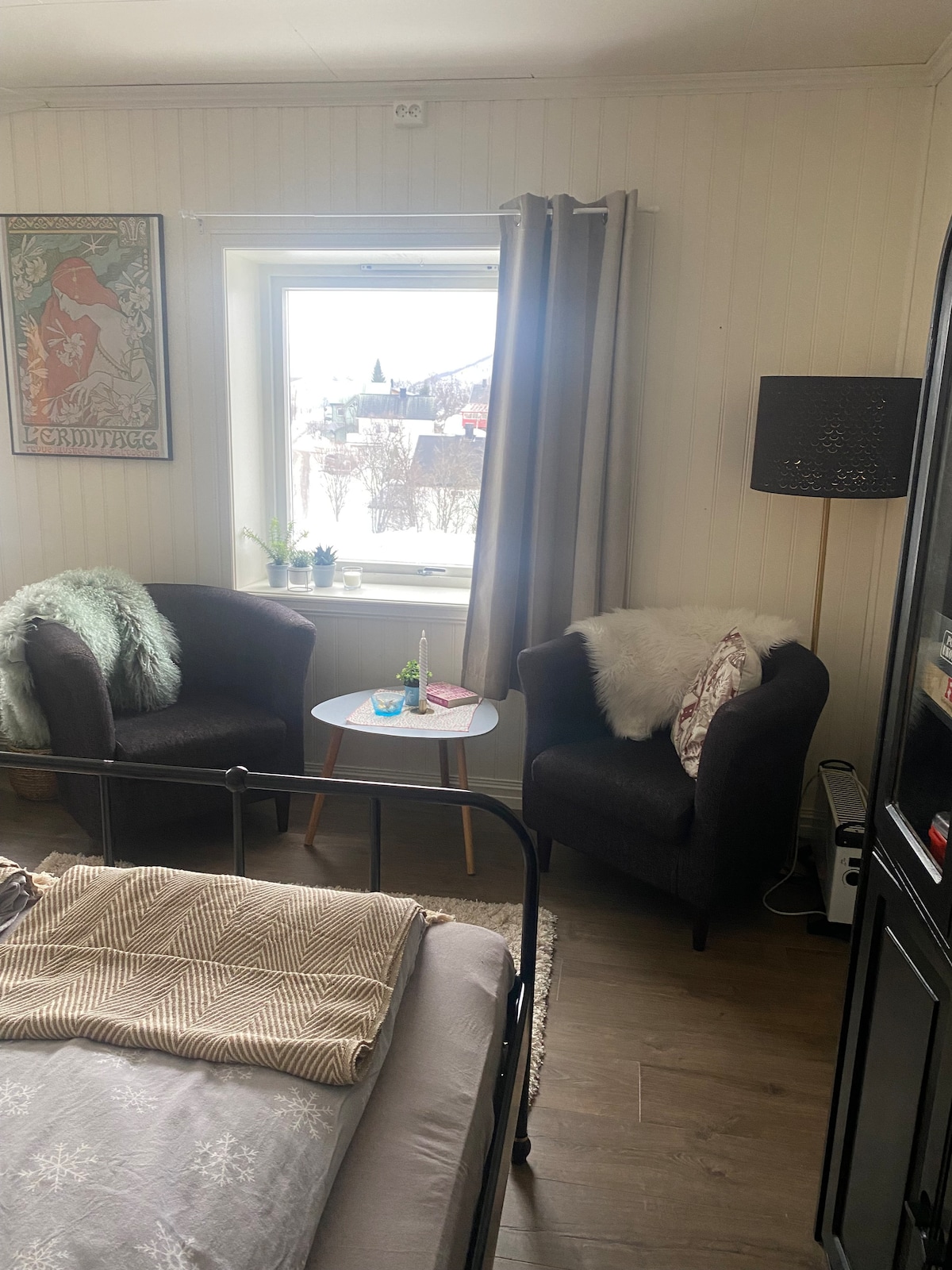 All inclusive. towel etc. Fresh, cold drinking water from the tap. 1 min to bus stop. 5 min bus to the city centre. 15 minute walk to the city centre. By agreement and fee of 300 NOK possibility to use sauna with snow bath. One double bed 120 meters wide and the other 140. For bookings after 24.11.25. A free bacalao meal or one fish cake meal for free, if desired, for stays over three days.