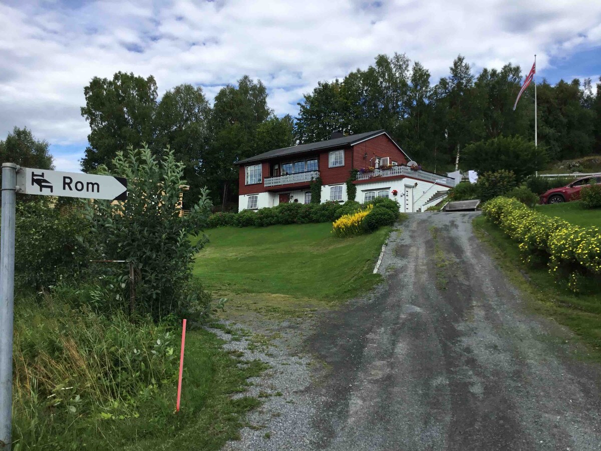 Her kan du bo tett innpå naturen og være nær byen i et helt nytt gjestehus. Gratis parkering under tak. Gjestehuset er svært unik for sin beliggenhet nær sjøen og utsikt mot byen og mot fjellene. Soveplassen på hemsen er utformet slik at du kan ligge under stjernehimmelen med takvindu over hele deg og samtidig ser over fjorden og byen i sidevinduet. Best for 2 personer i dobbelseng men med en sove mulighet på sovesofa. Egen bil/leiebil/taxi anbefales Flyplassen er bare 9 min med bil unna
