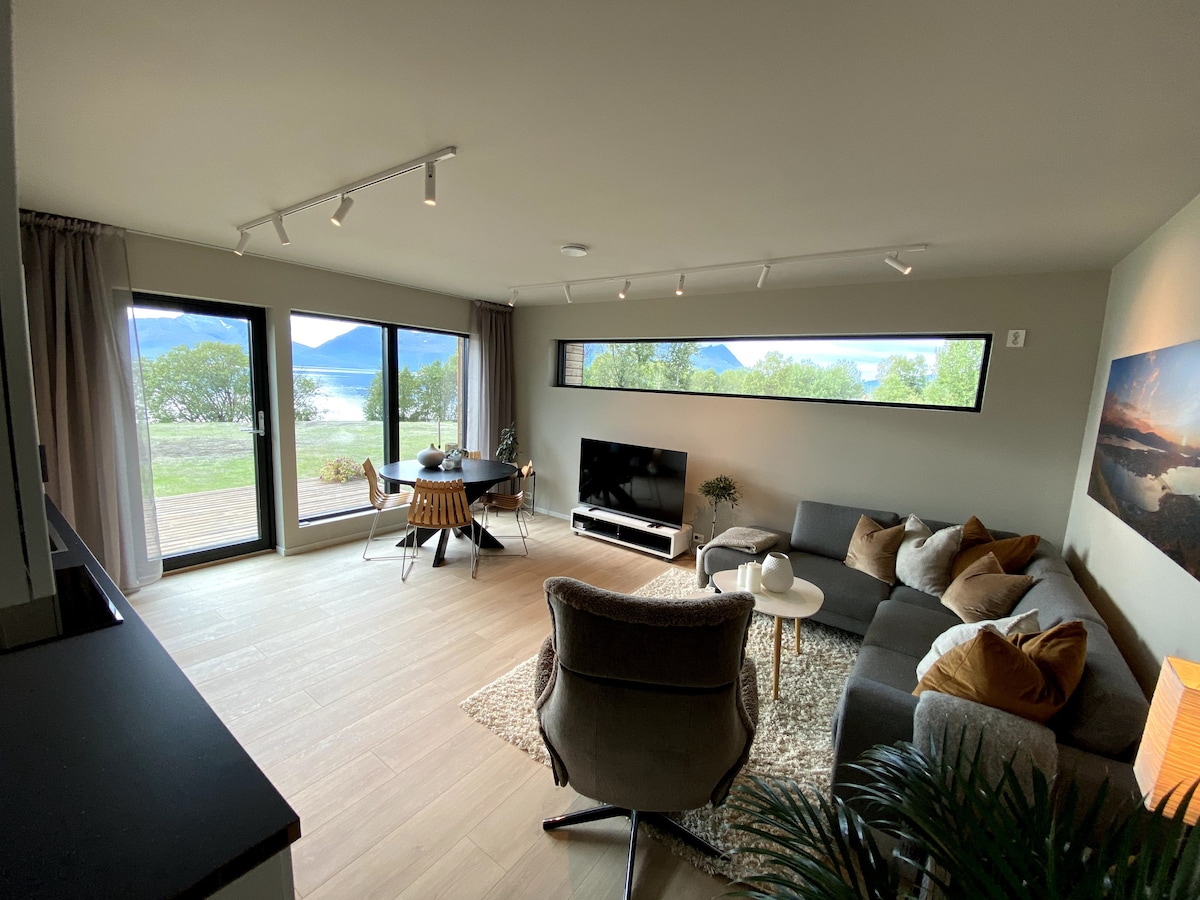 Spectacular new build house (2018) in a lovely, quiet area with a beautiful view to the fjord/sea, mountains and forest in Kvaløya /Tromsø. You can watch the beautiful northern light / aurora borealis from the huge window (10 sqm), sitting in the living room with a cup of tea or coffee in your hand:-) This is a perfect place for tourists who wants to see the northern light, whales in the fjord at winter, hiking/ skiing in the mountains or everything else you want in this lovely city.