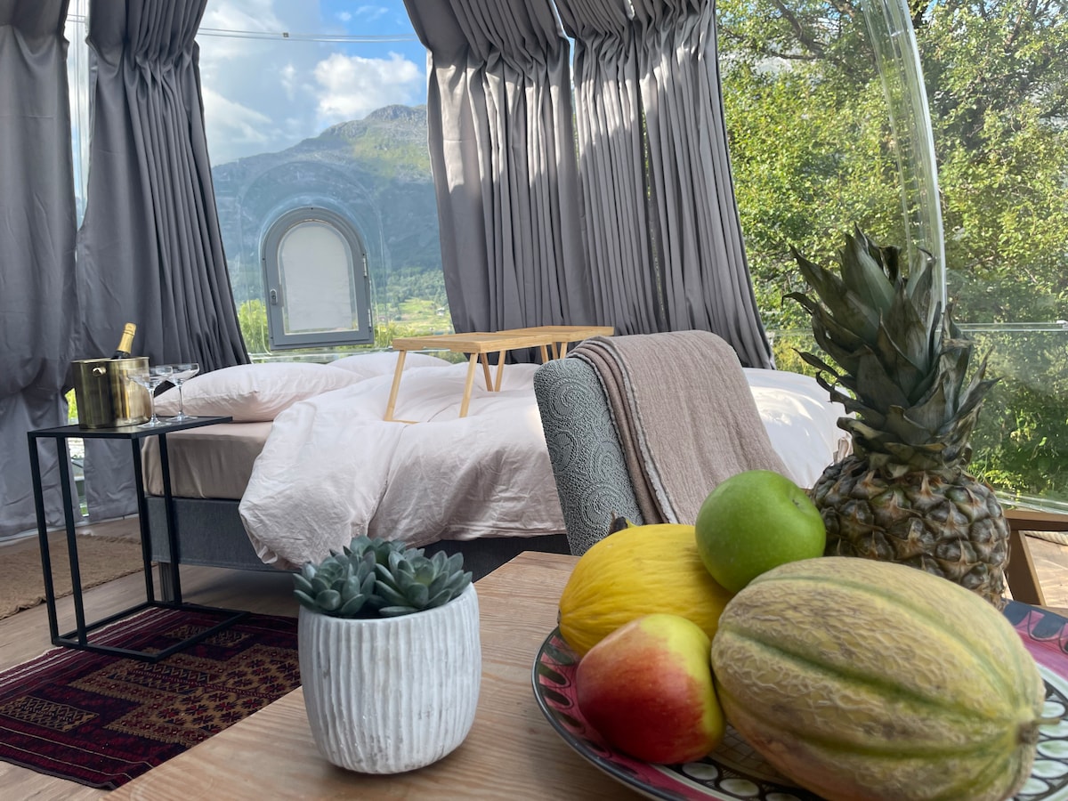 Enjoy the lovely setting of this romantic spot with an amazing view. Sleep under the sky, but inside, under a big warm Norwegian douvet and experience the nature and the changing weather. - Counting the stars, listening to the wind and rain or watching the magic northen light! This will be a night to remember! You can upgrade your stay to include: - welcome bubbles with some snacks - dinner served either in the dome, or in the restaurant - breakfast in bed or in the restaurant. 1500 NOK
