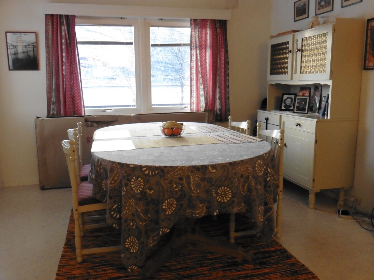Our home is located 5-minutes walk from the main street Storgata. Most of the attractions are within walking distance such as Ishavskatedral, museums, Prestvannet - just to name few. You will be served vegetarian breakfast (coffee/tea, granola, croissants, juice, bread/butter/jam, fruits) every morning. The home is all yours in between 08-15 and often in the evenings for some time. When home, you are served a vegetarian dinner, but you are welcomed to cook in the kitchen as you please!