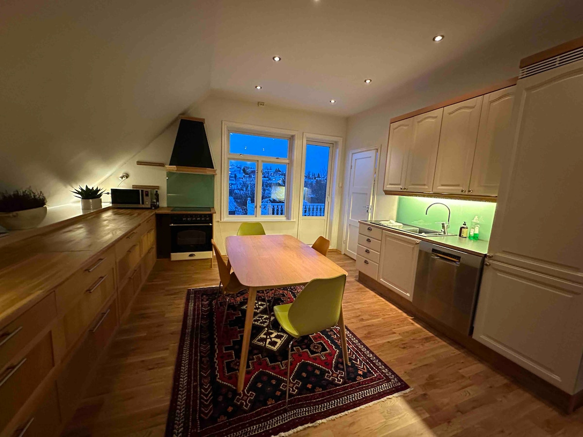 360° utsikt fra to balkonger gir deg fantastisk utsikt over byen, fjellene og nordlyset. Leiligheten er romslig på 90 m2 i annen etasje i en historisk villa. Gratis parkering på eiendommen.