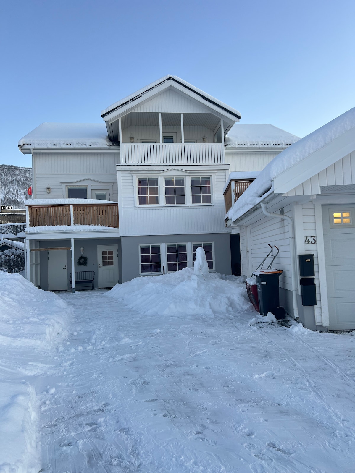 3 floor house with huge windows hovering above the city. ( has Turkish steam room spa) The roof top terrace gives you 360 view to all surrounding mountains. Moreover, perfect condition to admire the Northern lights at night. House is located 1,2 km away from centrum of Tromsø, buss from to house (5min to centrum). has 2 bedrooms in 1 floor (4ppl) and large couch (sleeping) in living room 2nd floor. 3rd floor is washing machine and dryer with entrance to Terrace. Unique wooden style, 70m2
