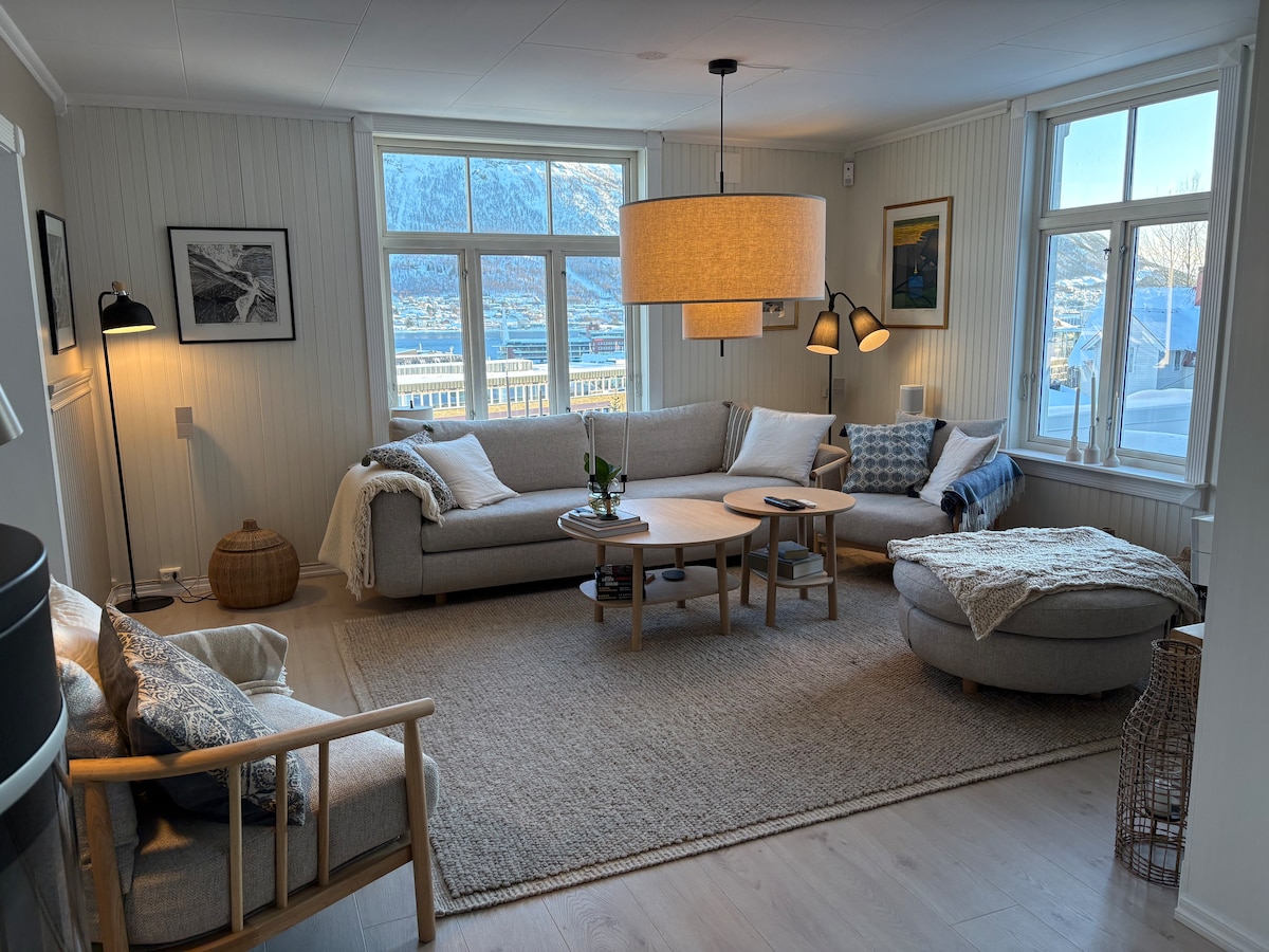 Sentrumsnær leilighet i vannkanten. 14 minutters gange til kjernen av byens restauranter og kjøpesenter. Leiligheten er varm og komfortabel, med første rads utsikt over havet, fjellheisen og Tromsøbrua. Gode bussforbindelser og matbutikker i nærheten. Kjøkkenet har det du trenger for å tilberede og nyte måltider hjemme. Oppreide senger og håndklær. To garderobeskap. Her kan du slappe og samtidig nyte utsikten av landskapet, når du ikke er ute å utforsker det spennende arktiske Tromsø.