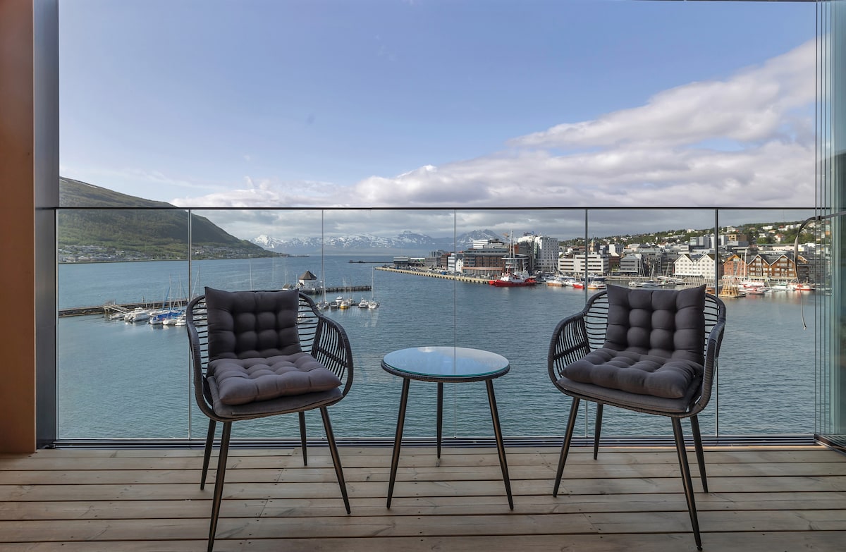 Welcome to a stunning penthouse perched atop downtown Tromsø, where panoramic mountain and sea views meet modern luxury. Imagine relaxing in the cozy living room, with the magical Northern Lights dancing across the sky right outside your window. This spacious 2-bedroom, 1-bathroom apartment is thoughtfully designed for comfort and style, featuring a fully equipped kitchen. Enjoy the fresh Arctic air on the terrace or in the jacuzzi, while taking in the breathtaking views of the town below.