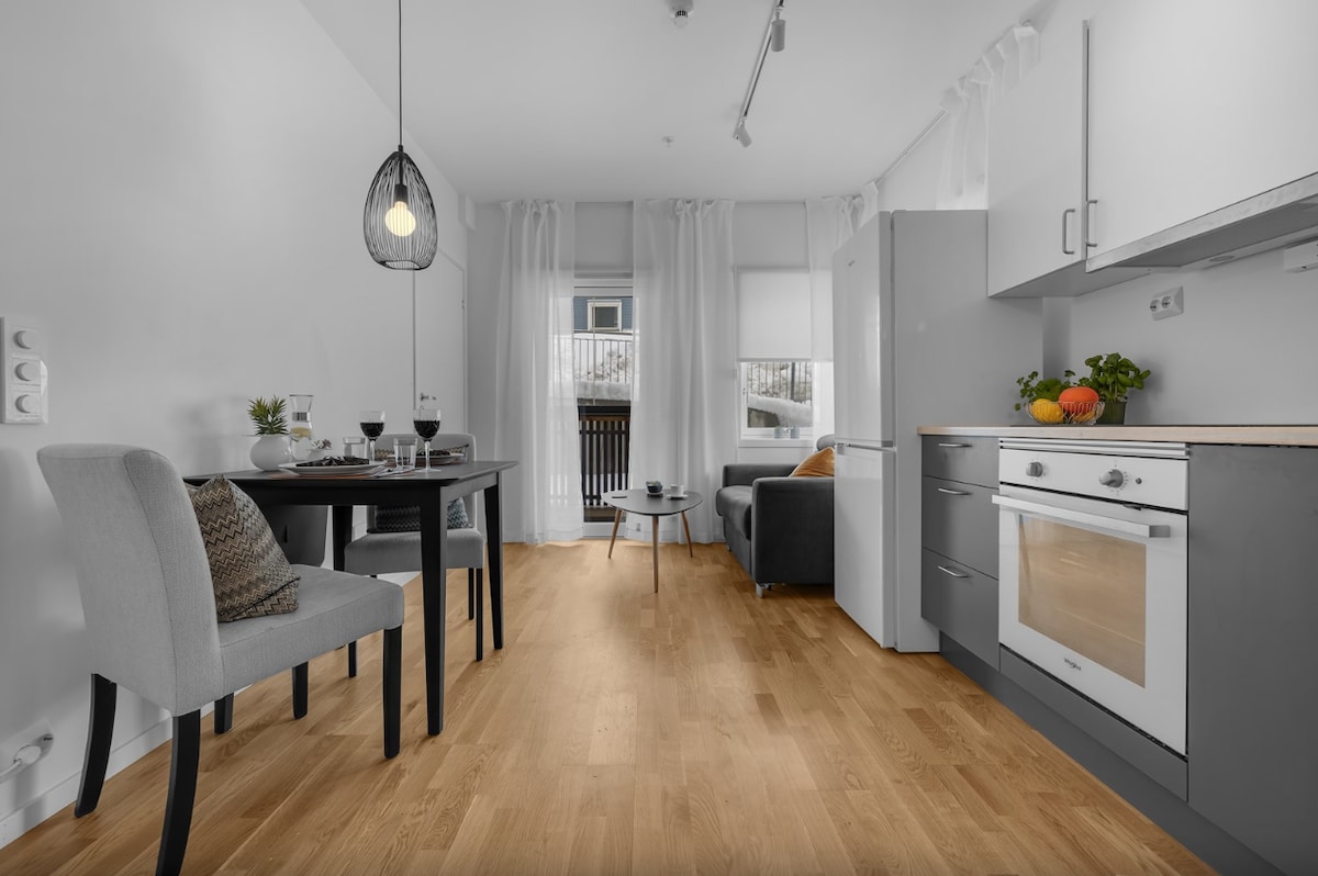 Enjoy a stylish experience located at the main pedestrian/shopping street in Tromsø City Center. Private balcony with view over the street. Close to everything. Pubs, restaurants, shops, attractions, tour pickup points etc. Newly refurnished and equipped with everything you need to enjoy your stay. Fully equipped kitchen and bathroom with a washing machine. A round dining table with a space for four person to enjoy a social meal. TV with cable TV. High-speed fiber optic WiFi and Ethernet.