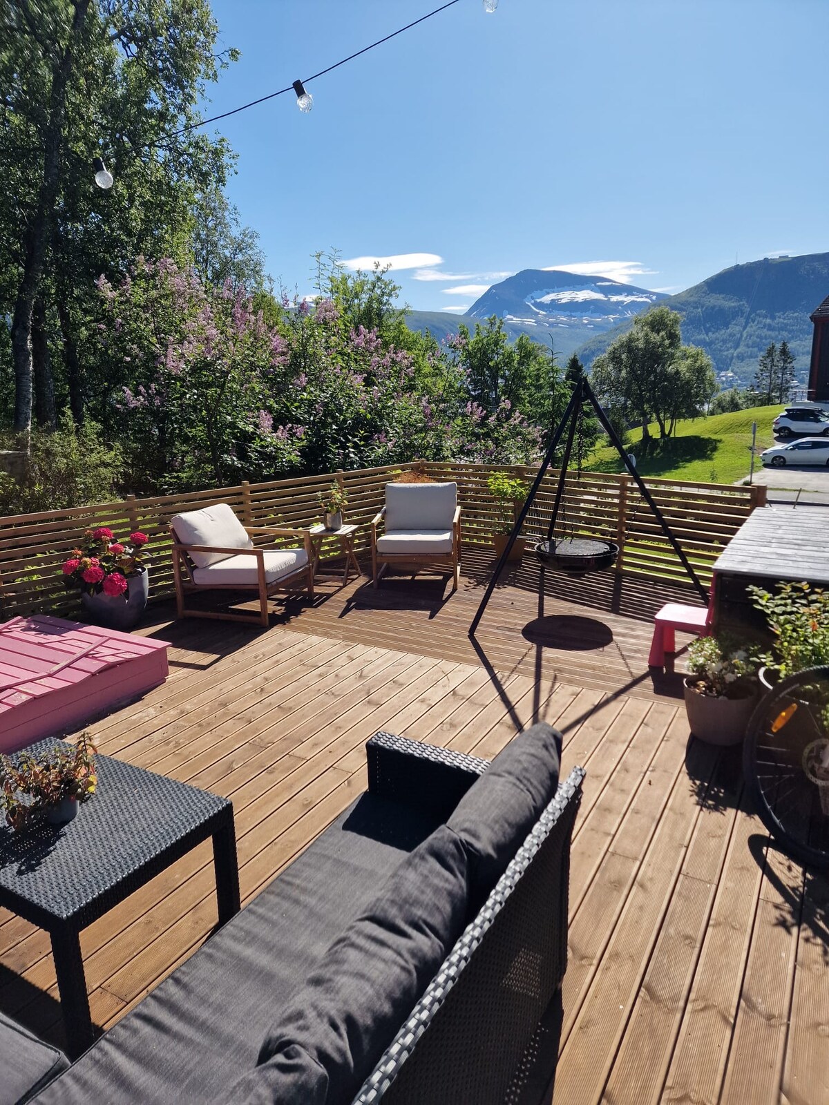 Fredelig rekkehus på øverste vei mot fjellet gir nydelig utsikt mot Tromsø. Lite lysforurensing slik at Nordlys kan oppleves direkte fra balkongen eller rett utenfor huset. God bussforbindelse både til sentrum og flyplassen, buss tar kun 10-15 minutt til byen. Gratis parkering på gjesteparkeringsplass like nedetor huset. Varmt og koselig hus, unik planløsning over 4 halvplan med stor takhøyde i stuen. To soverom, med mulighet for å sette opp gjesteseng i stuen.
