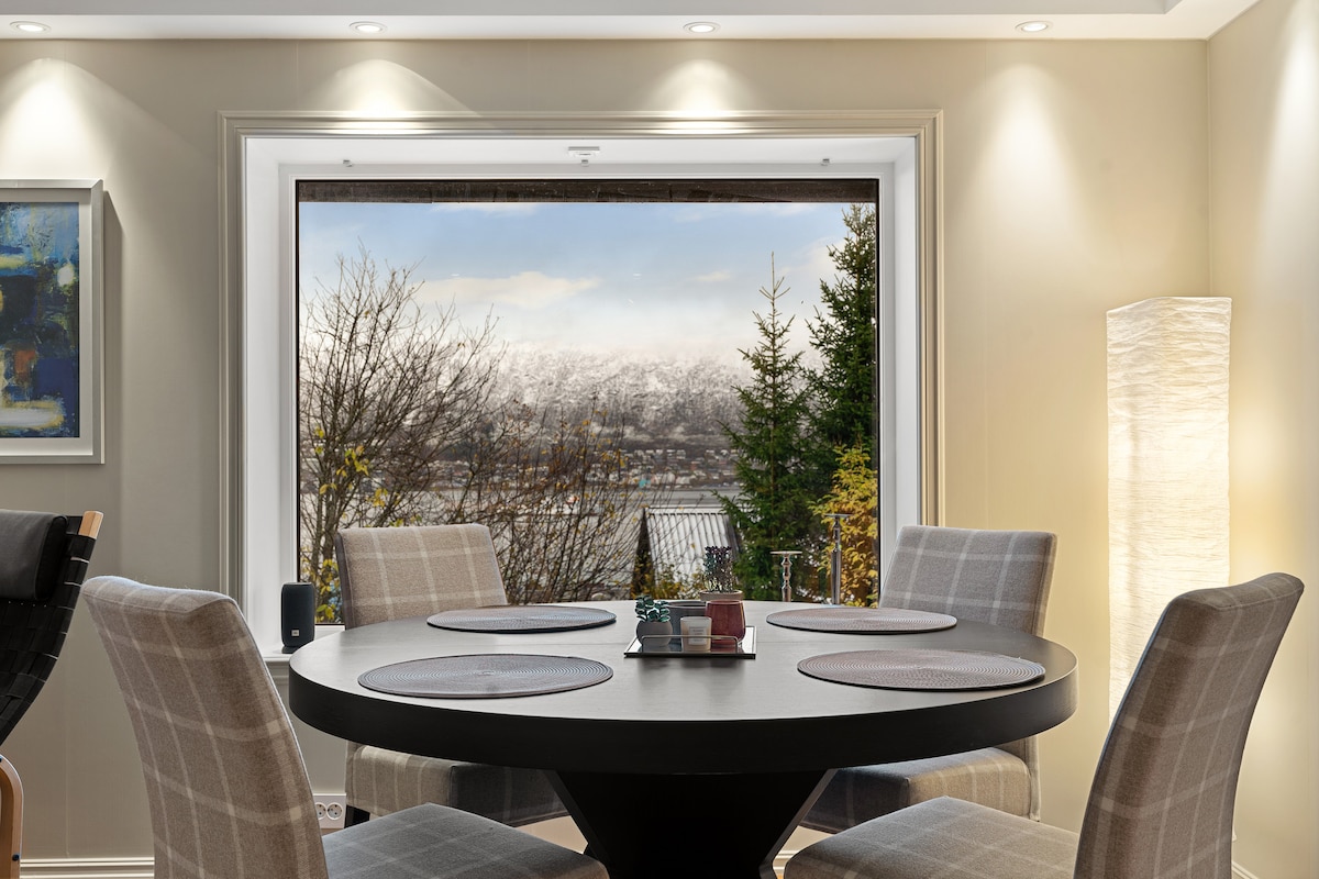 3 floor house with huge windows hovering above the city. ( has Turkish steam room spa) The roof top terrace gives you 360 view to all surrounding mountains. Moreover, perfect condition to admire the Northern lights at night. House is located 1,2 km away from centrum of Tromsø, buss from to house (5min to centrum). has 2 bedrooms in 1 floor (4ppl) and large couch (sleeping) in living room 2nd floor. 3rd floor is washing machine and dryer with entrance to Terrace. Unique wooden style, 70m2