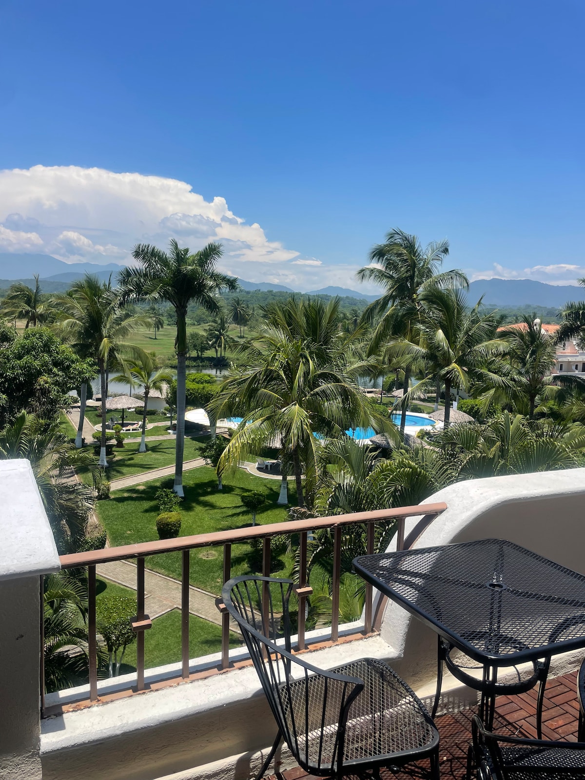 Despierta con el canto de los pájaros y toma café en la terraza con una agradable vista al campo de golf. Aquí te sentirás bienvenido, cómodo y relajado al instante. Se ubica en el primer piso, 2 recamaras con Baños, utensilios básicos para cocinar. Accesible para caminar al Centro Comercial de Ixtapa, ande en bicicleta por la ciclopista que está a 3 minutos de distancia o camine 15 minutos hasta el acceso principal a Playa El Palmar. Transporte público con precios accesibles.