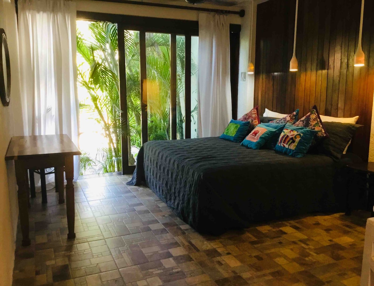 See all listings at airbnb.com/users/show/251077351 Private courtyard, AC, kitchen, workstation STARLINK WiFi, secure parking, 2 pools, adults only 14+ & amazing tropical gardens. Please read reviews. Private separate bedrooms available. Direct beachfront access to pristine Playa Blanca . 5 Restaurants within 500 meters and over 30 in village of Barra de Potosi. Sealy pillowtop king mattress. Public buses . Meals prepared for guests. BBQ & private loungers. Grocery & free airport pickup.