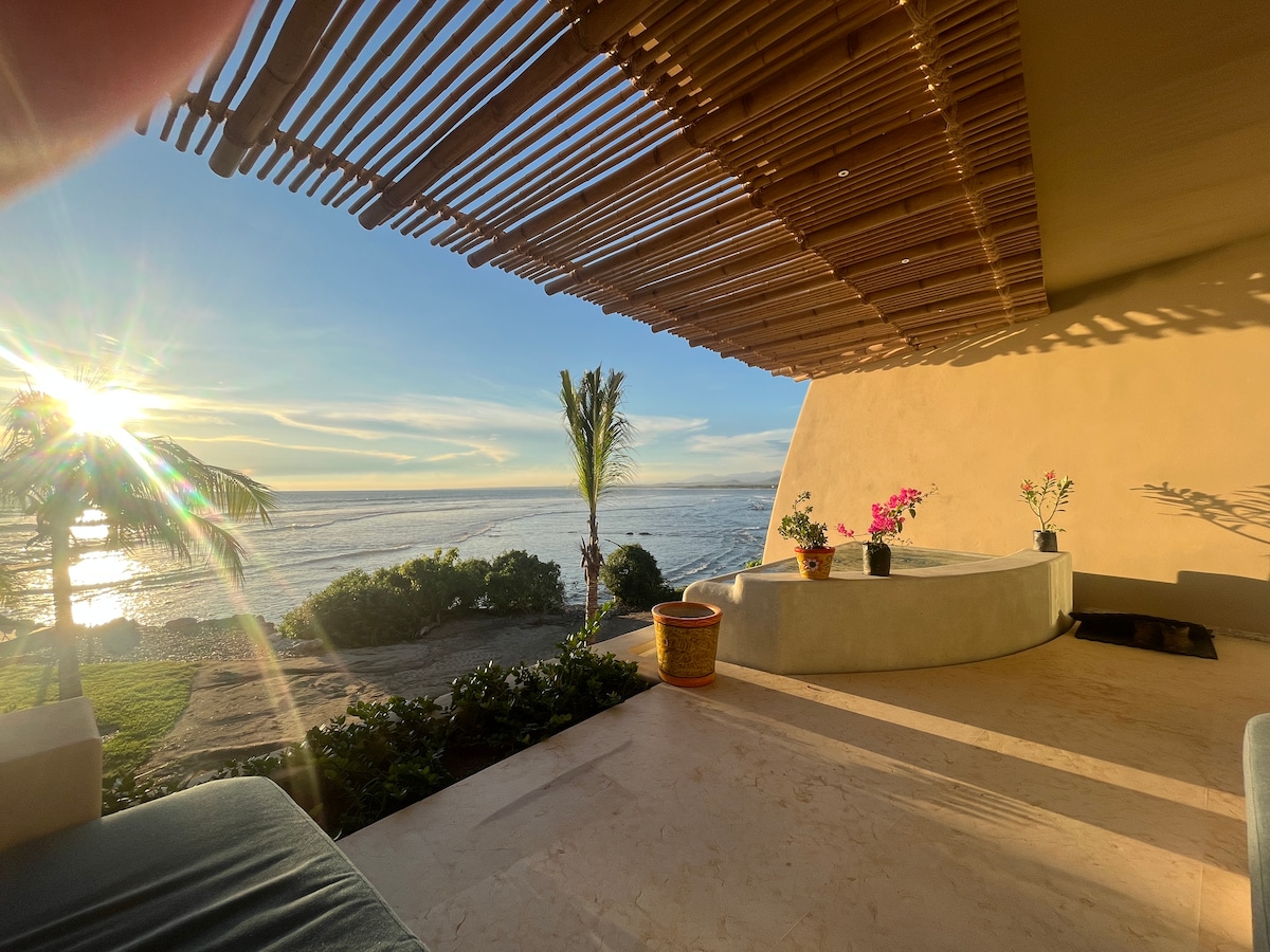 Sol de Fuego is a 1 bedroom, 1 bathroom suite with a king bed and is suitable for 2 guests. On the 2nd floor with closet space, AC and a full kitchen. Private patio, views to the ocean, beautiful woodwork and set back from the pool make this a very desirable suite. Maid service and purified water included. Quinto Sol Troncones is in the best location with a rock free beach and walking distance to many food/liquor stores, clothing boutiques, live music and 20+restaurants.