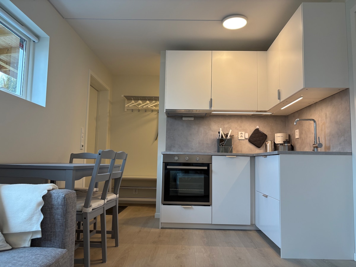 Ny leilighet på 55 m2 med to soverom. Balansert ventilasjon. Termostat på alle rom. Romslige dobbeltsenger (180 cm bredde) på begge soverommene. Sovesofa med bredde på 140 cm kan res opp til en eller to personer i tillegg. Sjøutsikt og utgang til hage. Rolig og fredelig nabolag med lekeplass og turområder like ved. Kort vei til butikk og bussholdeplass. Det tar omkring 20 minutter med buss til sentrum.