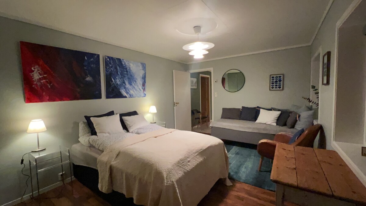 Ny leilighet på 55 m2 med to soverom. Balansert ventilasjon. Termostat på alle rom. Romslige dobbeltsenger (180 cm bredde) på begge soverommene. Sovesofa med bredde på 140 cm kan res opp til en eller to personer i tillegg. Sjøutsikt og utgang til hage. Rolig og fredelig nabolag med lekeplass og turområder like ved. Kort vei til butikk og bussholdeplass. Det tar omkring 20 minutter med buss til sentrum.