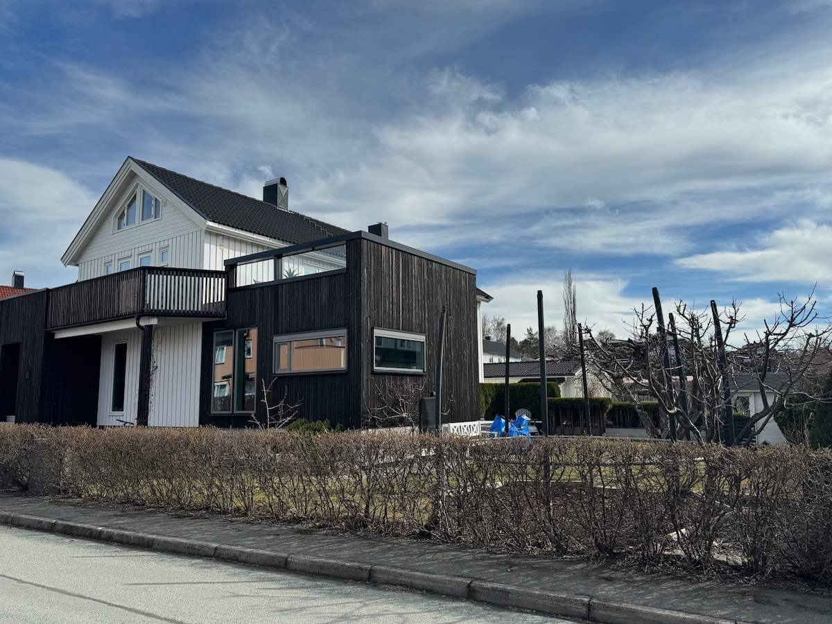 Modern house 10 min drive from Granåsen Ski arena. 500 metres to the airport bus and 300 m to bus stop for the city centre (12 min ride). Four bedrooms, big living room from 2021 with a huge couch and large dinner table for eight persons. Newly refurbished kitchen, newly refurbished bathroom with steam shower, toilet room on ground floor, and a big hall. WiFi, 65" TV screen, AC. Free parking for up to five cars. Several grocery stores a few minutes walk away.