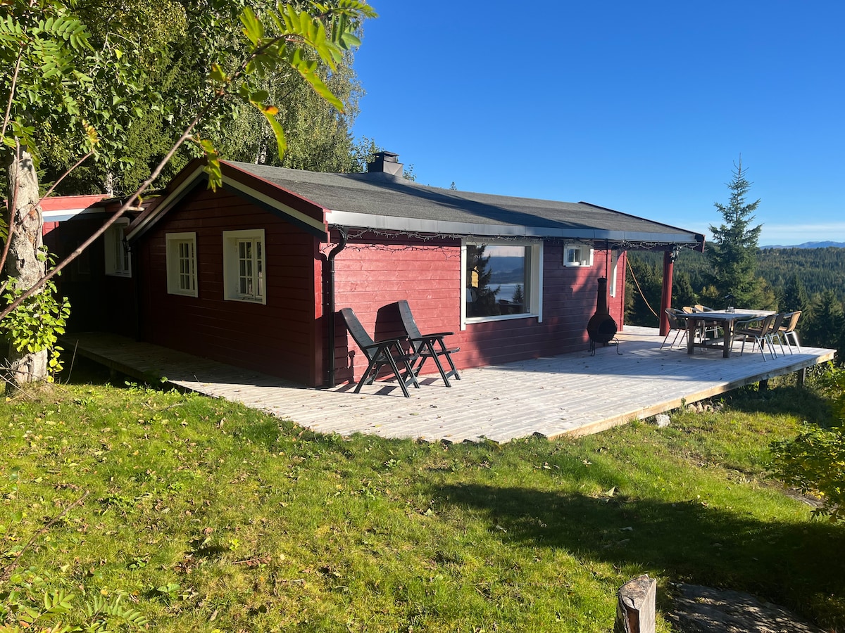 Cabin with magnificent view in a quiet place near Trondheim. Lots of outdoor space with terrace, BBQ, trampoline, garden and trees (3 acres) and easy access to hiking paths in Estenstadmarka. About 65 sqm indoor space with fully equipped kitchen and dining room with great view and fire place, living room with sofas/chairs, two bedrooms and loft bed, and a new electric toilet. No water resource: rain water from a container for washing. Drinking water needs to be brought to the cabin