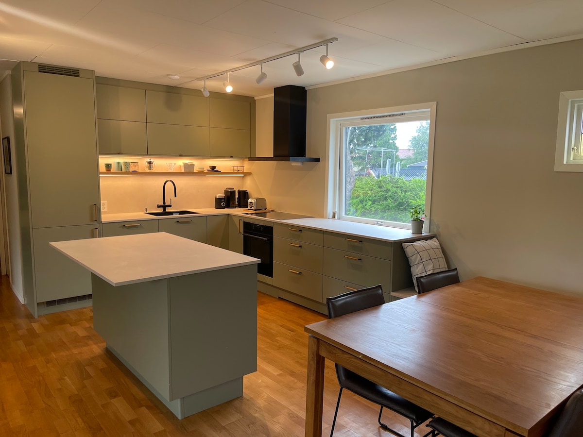 Sentral enebolig med normal standard. Boligen lugger i et rolig og fint strøk. Det er fire soverom i huset, to bad med toalett og dusj. Det finnes også et vaskerom med ekstra dusj og et ekstra gjestetoalett ved inngangen. To av soverommene har dobbeltsenger, og to soverom har to enkeltsenger i hvert rom. Det er parkering for to-tre biler med én elbil-lader tilgjengelig. Huset passer best for familier eller grupper. Vi bor her til vanlig selv, så det finnes private gjenstander i boligen.