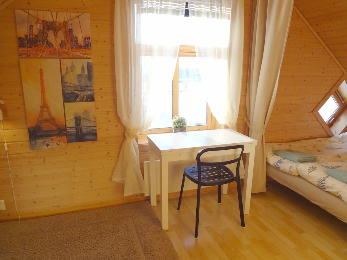 (See the MAP in the pictures for the exact location) 2 rooms with kitchen/bathroom in loft apartment (3rd fl.) Cozy kitchen with everything you need, including dishwashing machine. -------------- (Se kart i bildene for eksakt lokalitet). 2 roms med kjøkken&bad i loftsleilighet (3. etg.) Koselig kjøkken med alt du trenger inkl oppvaskmaskin.