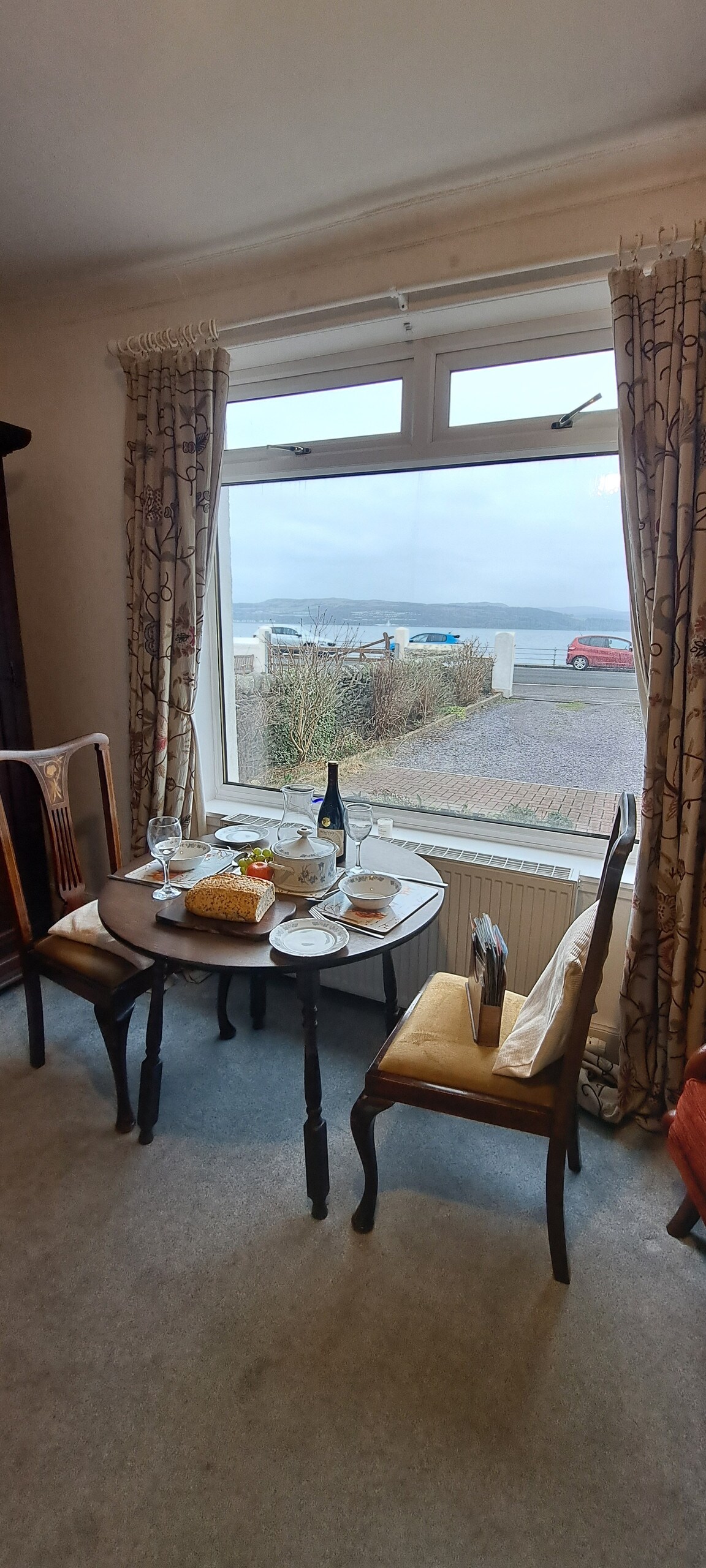 Accommodation 2/3 Self-contained flat attached to main house with own entrance, on the sea front in the centre of Dunoon, with stunning views across the Clyde and down to Cumbrae, Bute and Arran. 1/4 mile to passenger ferry and one and a half to Hunter's Quay car ferry,5/10 minutes walk to shops, cinema, eateries. Walk, cycle, kayak, swim. Book-lined lounge/study with sofa bed, double bedroom, kitchen, shower room, access to secure back garden with fish pond. Dogs welcome if friendly to mine.