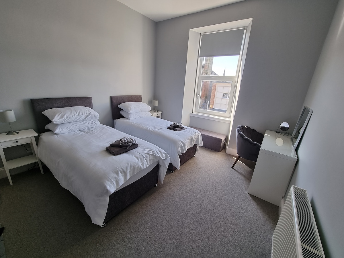 All rooms can be set up as a twin or super kingsize, please request which configuration you require at the time of booking. 3 bedroom, 2 shower room apartment in the centre of Troon in pristine condition, Minutes walk from all restaurants, cafes bar's and shops. Train station 2 minute walk. We also have 2 sister apartments 'marine view'. 3 bedroom/2 bathroom with seaviews and Aparment@No2 3bed/3bath. See more on airbnb listing.