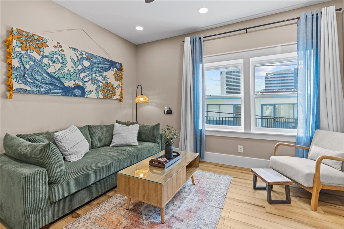 HEATED FLOORS. Newly renovated 2nd-floor apartment with luxury amenities just steps from the beach/boardwalk. Enjoy a spacious king bed, heated floors, and large smart TVs. The fully equipped kitchen is perfect for cooking, while the cozy living and dining areas provide ample space to relax. The stylish bathroom features a double sink and beautiful tiled shower. This perfectly located modern space offers comfort and convenience for your stay.