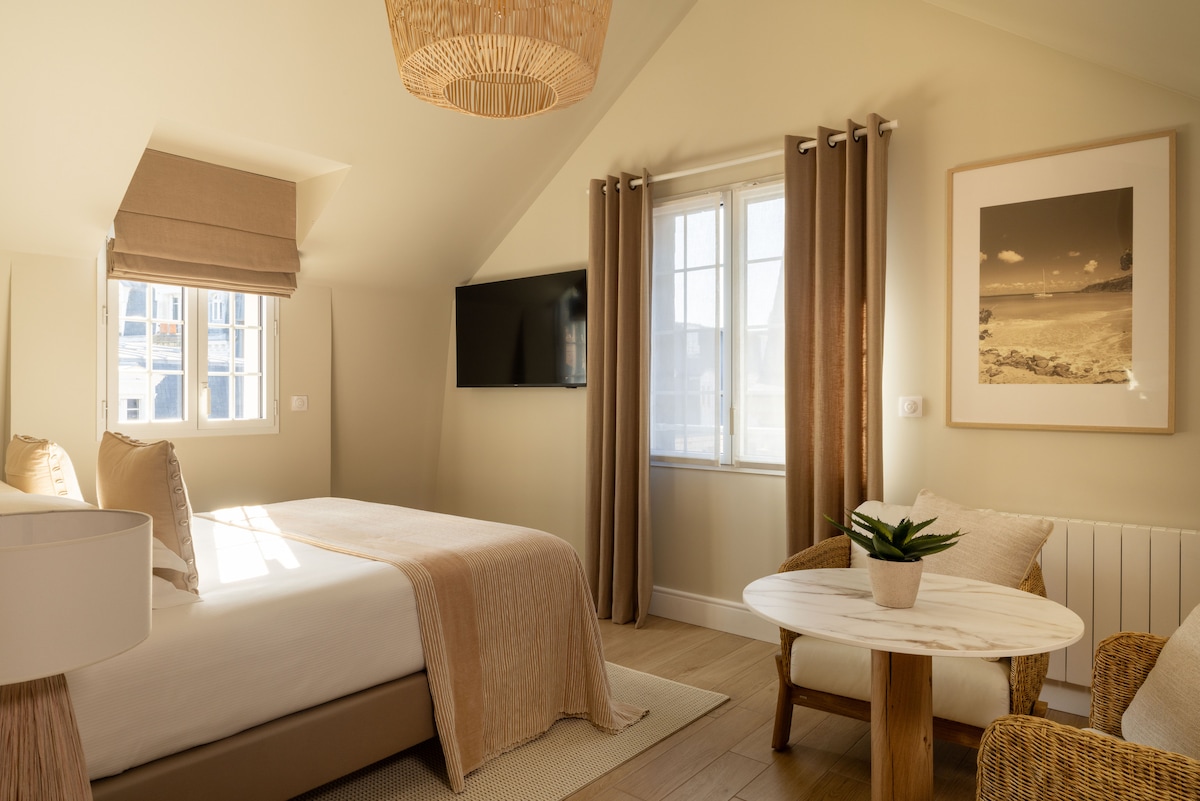 Escape to our radiant duplex apartment located in the heart of Deauville! Fully renovated in November, enjoy this lovely well-equipped 40m² flat boasting 2 en-suite bedrooms and an exquisite living room with open-kitchen & beautiful views. This top-floor very quiet duplex bathes in natural light, offering a peaceful and stylish living space for up to 4 guests. ** Location** Train station: 350m - 4 min walk Place Morny: 230m - 2min walk Beach: 900m - 10 min walk Non-smoking, not animal friendly