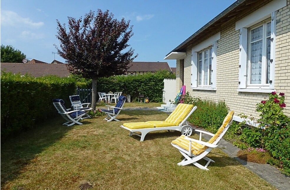 Maison Individuelle à 2km de Deauville. Plage sable fin 370m. Jardin privatif entretenu 600m². Meubles de Jardin, Barbecue. Bus, Boulangerie/Pâtisserie 120m. Hippodrome 300m. Supermarché 800m. Gare SNCF 2,8Km. Terrain de Golf 3,5 km. Photos contractuelles: mobiliers rustiques. Lave-linge, sèche-linge, fer à repasser, sèche-cheveux. Canapé-lit du séjour d'appoint (matelas supérieur derrière le canapé). Draps, serviettes fournis. Animaux acceptés, jardin clos : grillage brise vue hauteur 1,20 m.