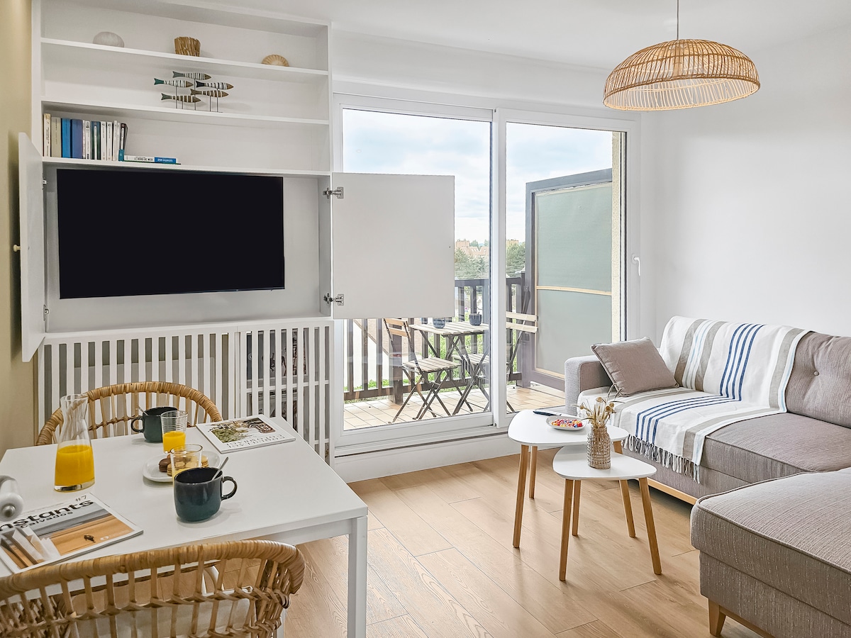 Studio de 25 m2 au calme qui offre une vue panoramique sur la mer, accès à pied au centre ville de Deauville/ Trouville, planches, plage, loisirs,commerces, gare ... Séjour donnant sur balcon avec vue mer situé dans la marina de Deauville-TV Cuisine équipée lave vaisselle, lave linge,salle de bains avec baignoire – Placards Couchage canapé rapido (lattes)2 personnes + 1 lit cabine (190x70). Appartement adaptė pour un long séjour. Parking gratuit sur place- protocole sanitaire covid.