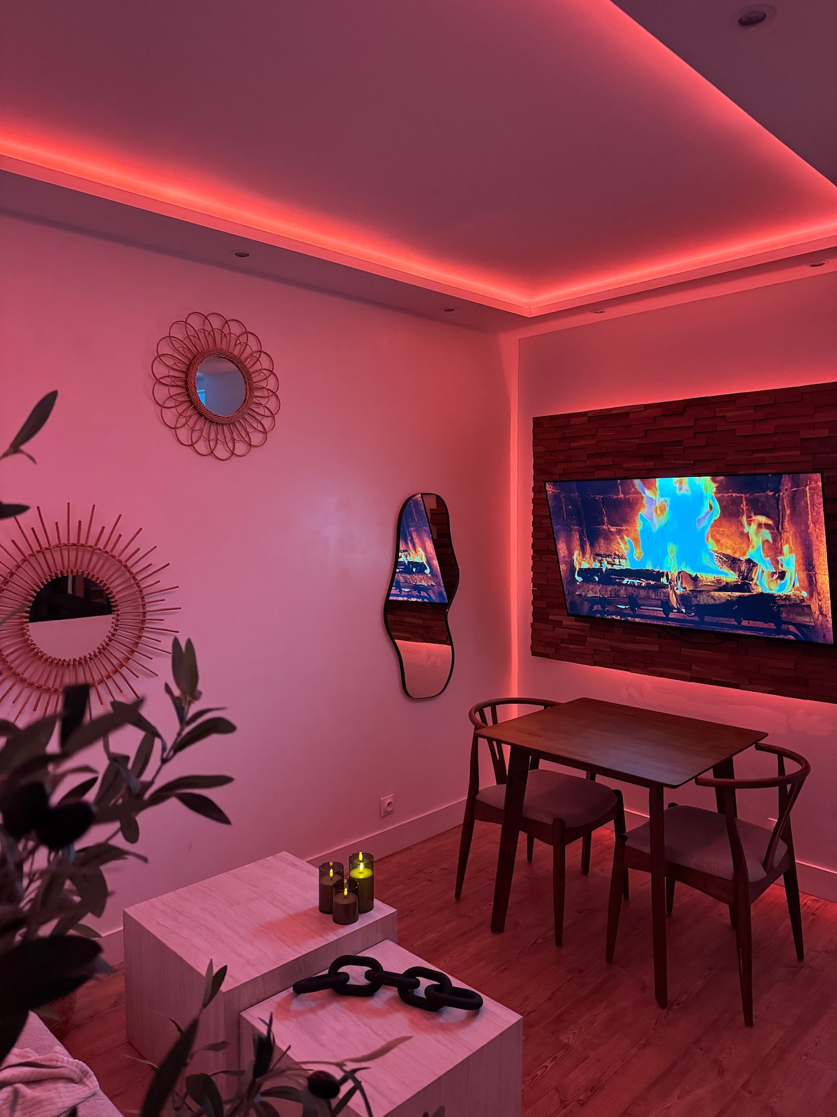 Cet appartement est le lieu parfait pour un moment d'évasion romantique à 2 🥰 Idéalement situé près de la plage, il possède plusieurs équipements de détente hauts de gamme : * Jacuzzi (eau remplacée à chaque passage), * Sauna, * Douche tropicale, * Cheminée à vapeur d'eau, * Lit king size avec un ciel étoilé * Leds et enceinte Bluetooth encastrée * Écran plat 170 cm Ambilight face au jacuzzi En résumé, toutes les clefs pour une parfaite évasion en amoureux !