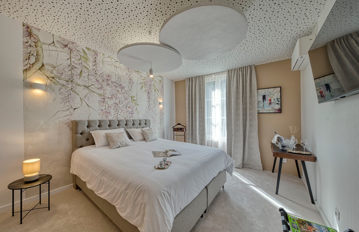 La Maison Juvénal des Ursins **** is located in the HISTORICAL CENTER of TROYES, ruelle des chats with a view of the Madeleine church. Located near Rue Champeaux, where there are many restaurants. This three-story town house includes 6 bedrooms from 8 to 23 m², a flat-screen TV and internet access, an equipped kitchen opening onto a living-dining room of 80 m² (equipped with a fireplace), a terrace. of 26 m² and a very small garden of 9 m².