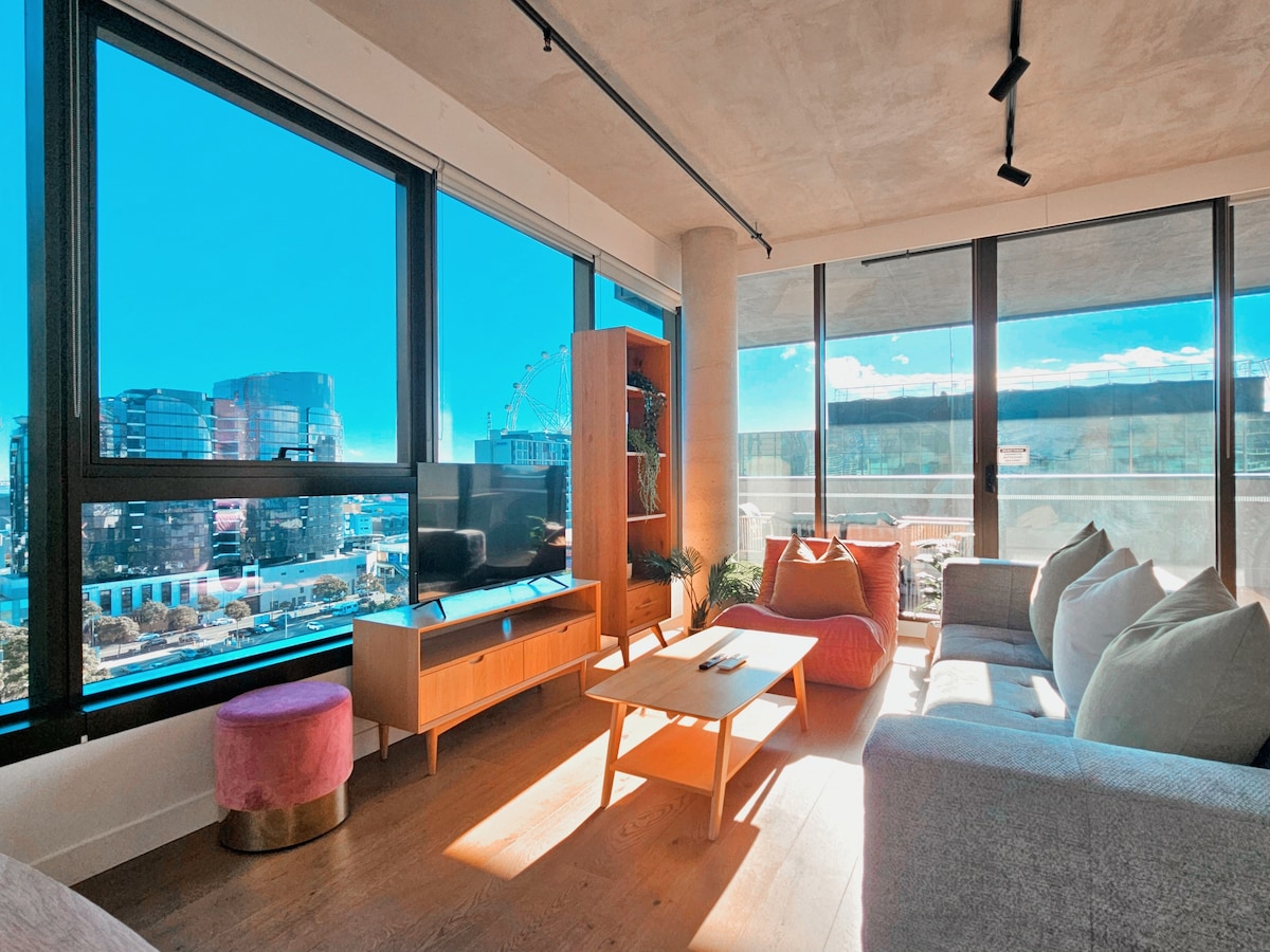 Enjoy a stylish, relaxed experience at this centrally located place. Try the top floor! In Melbourne CBD this place really stands out. Enjoy unencumbered views: the bay, river, Docklands, WestGate & Bolte Bridges, distant hills, city lights, phenomenal sunsets. Convenient. Walk to Crown, MConventionC, Marvel Stadium, Southern Cross Station, il Mercato Centrale. Great amenities. Pool/spa/sauna/gym. 1x quality queen bed + sofa 2x beds, linen, Hot shower, Kitchen, Ergonomic Desk, AppleTV.