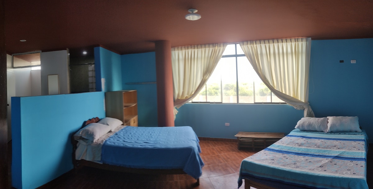 Lleva a toda la familia a este fantástico lugar ubicado en una zona residencial campestre rodeado de áreas verdes, lugares turísticos y restaurantes de buena comida de nuestra cultura Moche En Ombligo Muchik podrás disfrutar con seguridad y privacidad de la paz y tranquilidad que transmite si ambiente con clima cálido y acogedor. Nuestras habitaciones son amplias y comodas sin perder el toque campestre y minimalista. Organiza tus eventos, reuniones sociales al aire libre y graba tus recuerdos.
