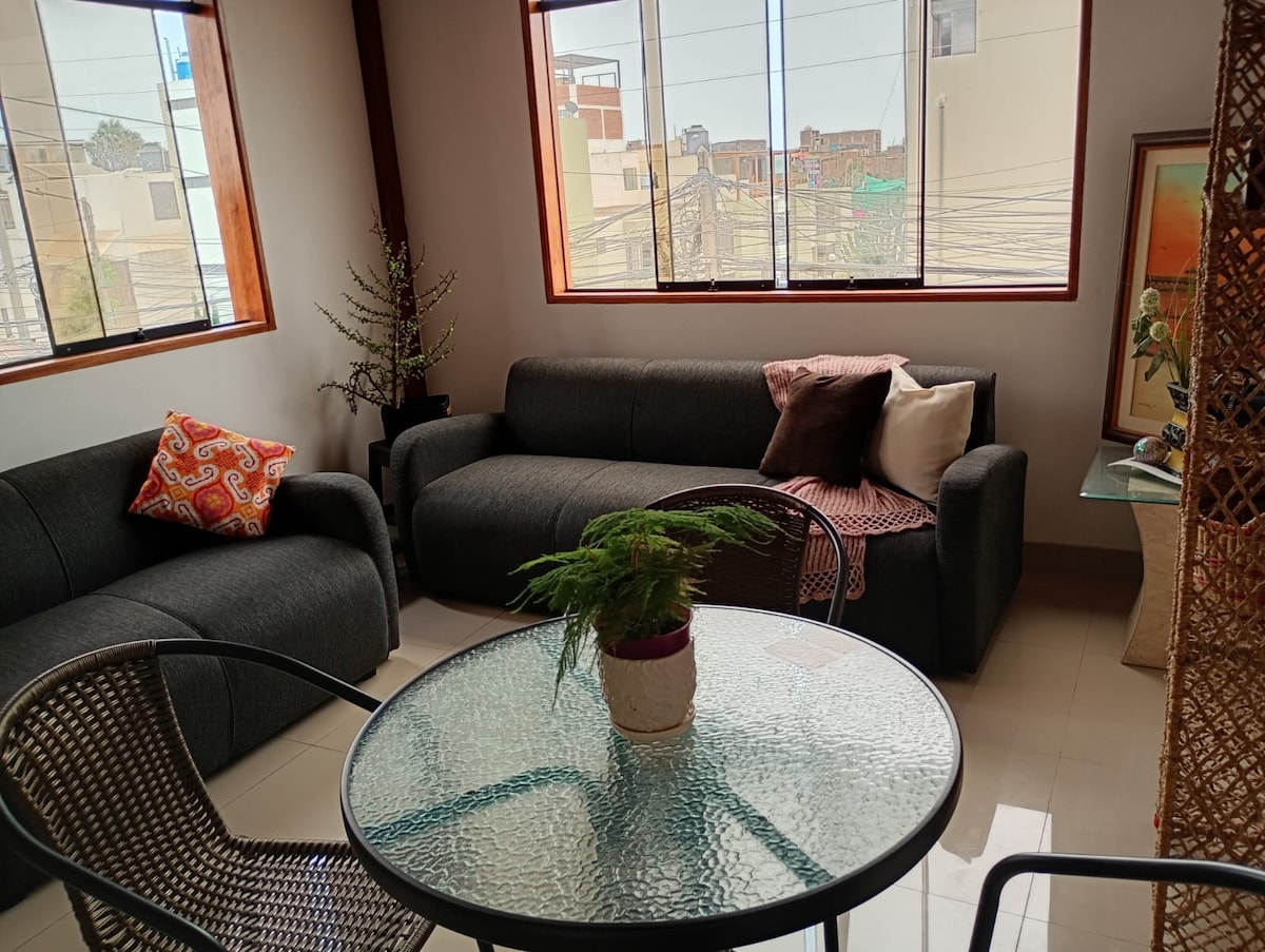 Privado ubicado a 2 minutos caminando a la playa, en EL Corazón de Huanchaco a media cuadra placita principal, departamento entero Excelente WIFI, SEGURO cordinamos check in y out dos dormitorios cualquier pregunta con gusto la responderé. Agua Caliente, cocina equipada,comedor y salita segundo piso. Estacionamiento en la calle o en la plaza hay vigilantes , tambien hay uno privado cerca. pueblo surf moche personas con buenas vibras!