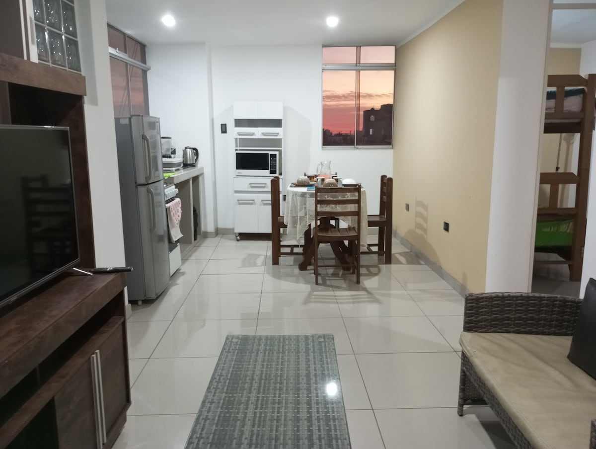 Mini Dpto. totalmente equipado, independiente, ubicado en el primer piso con 2 puertas, Una a la cochera y otra a la calle. El alojamiento es privado, confortable y práctico, con cocina, cama matrimonial para 2 personas, y un camarote con 2 camas, una sala con sofá cama, ubicado a 10 minutos de la ciudad de Trujillo, te conectamos con agencia de turismo de confianza que te pueden recoger de la casa, El lugar no es residencial pero muy cómodo.