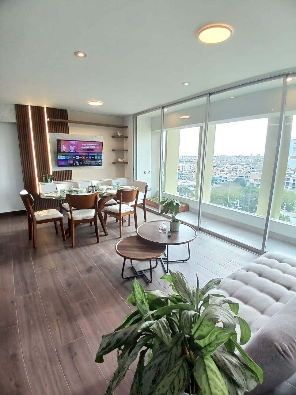 Encantados de recibirlos en este departamento con una vista panorámica privelegiada; exclusivo y céntrico que cuenta con todos los servicios necesarios para tener una increíble estadía, es de estreno y completamente amoblado. El departamento se encuentra en el corazón de una de las zonas más exclusivas de Trujillo. Ubicado convenientemente en Urb. California, en todo el parque grande de California. Se encuentra a 5 minutos del centro de la ciudad.