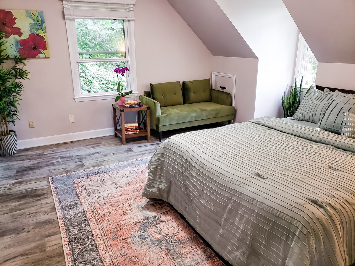 This is a newly renovated spacious private apartment above our home’s garage with a private entrance. The apartment has 1 bedroom with a queen-size bed and closet, a full bathroom with tub/shower, a kitchenette, and a living room. An additional twin-sized blow-up mattress is available upon request. Only smaller pets under 45 pounds are allowed with small added fee.