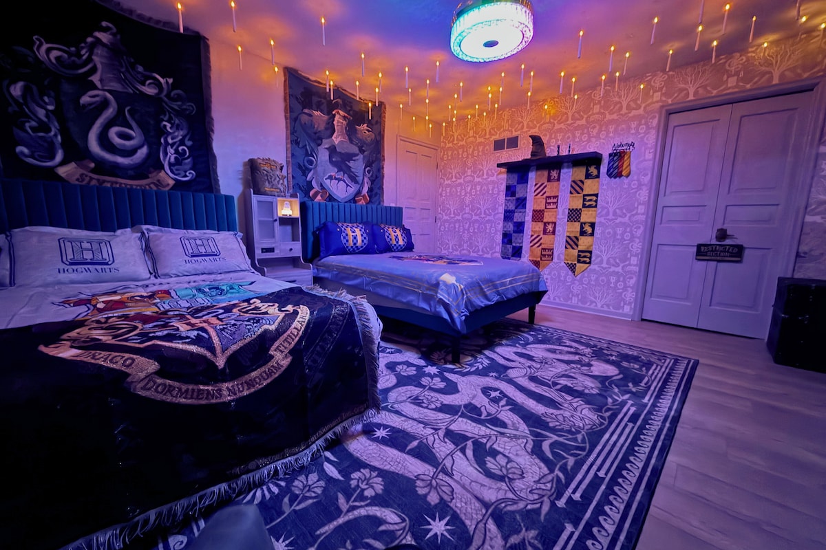 Fortuna is a multi-themed Luxury getaway where imagination meets comfort. This immersive retreat features four uniquely styled bedrooms -from Wizarding Magic to Barbie World to Ancient Egypt to Parisian Chic, perfect for families & memorable celebrations. Year-round 6-person hot tub on private patio facing wooded backyard, sleeps 12+ people, enclosed sunroom, game room with Pool Table & Video Games, gym, including a fully stocked kitchen.
