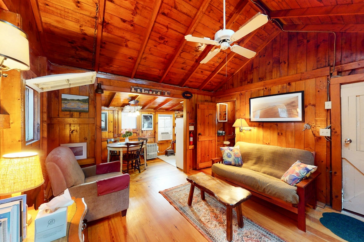 Couple/family fun all year in a charming, private Cape Cod cottage w/ screened in porch, patio & outdoor shower (in Nov/Dec/Jan becomes a Gingerbread cottage). Inside: open living space w/ queen bed & sitting space. Ladder leads to a short height sleeping loft w/ 2 twin beds. Full bathroom w/ indoor shower. Kitchenette- see description below. We supply tea, local coffee, spices, condiments, gas grill, ice chests, beach towels & chairs. To sleep up to 8, also rent our Upper Room on Airbnb.
