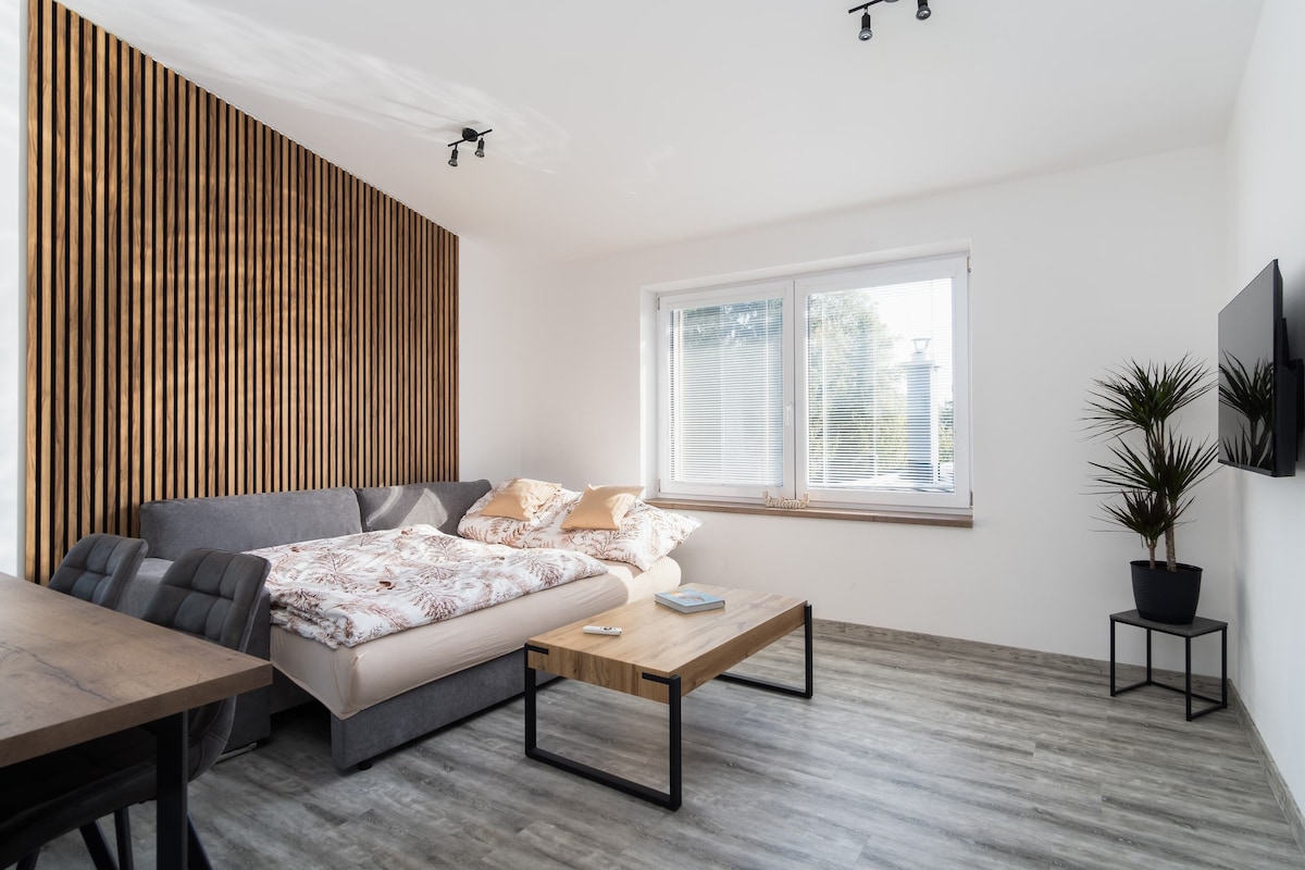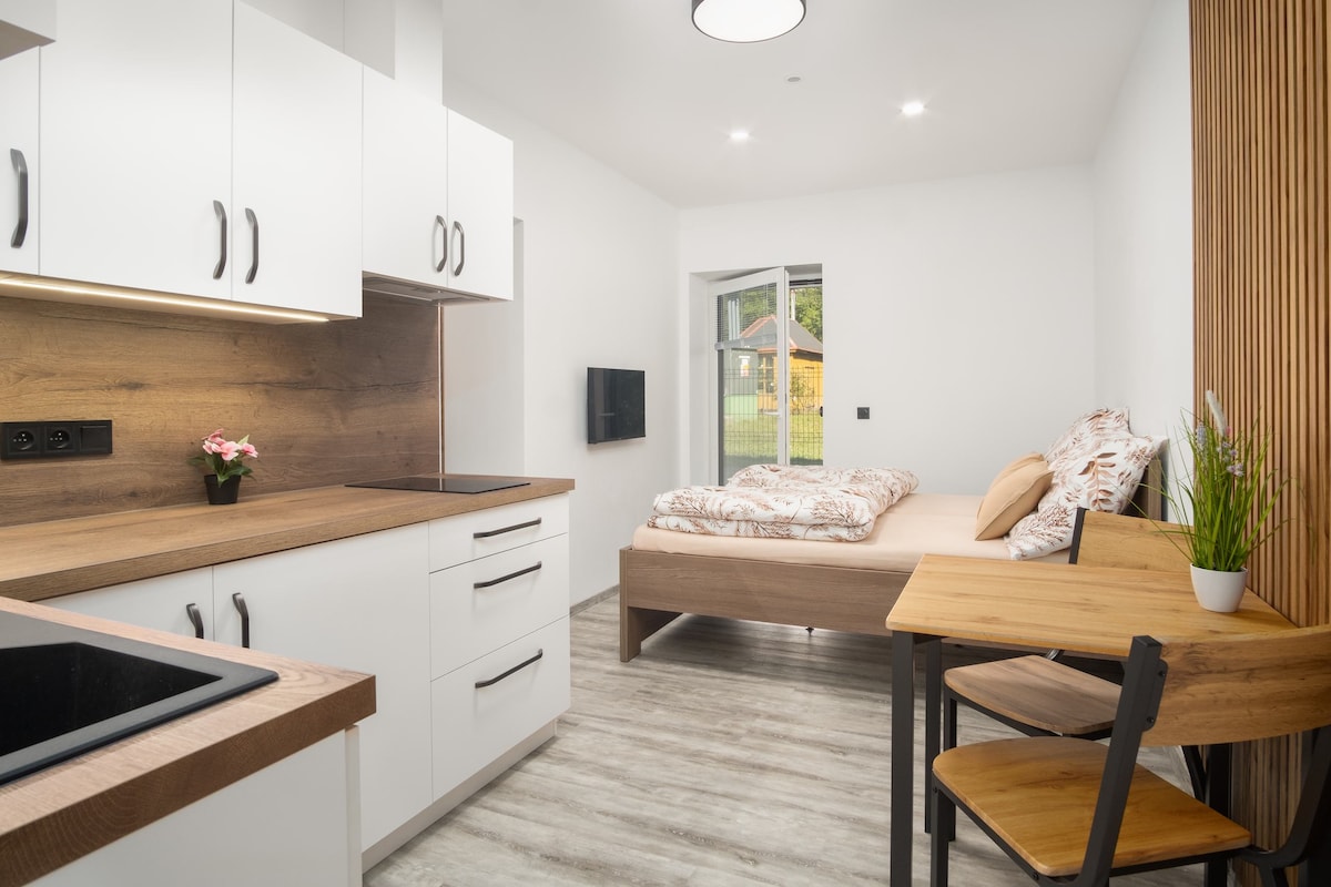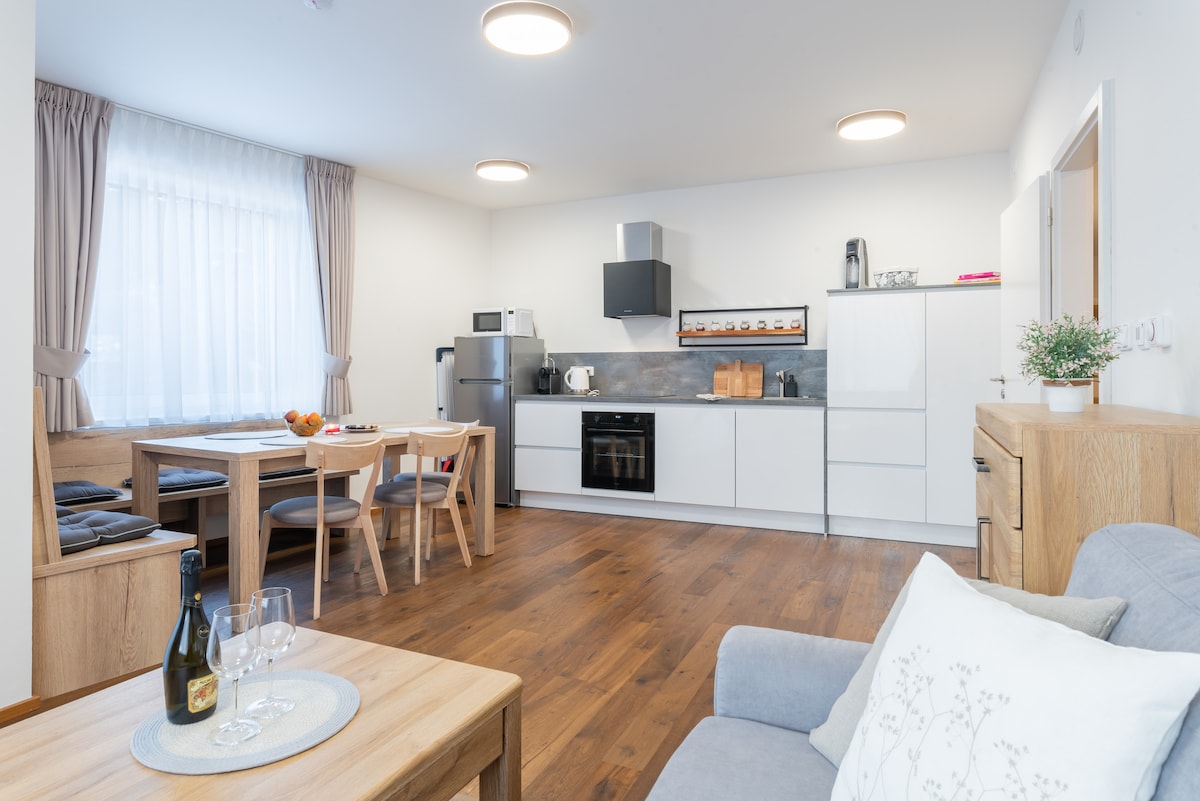 New luxury two-bed apartment (studio) KRKONOŠE on the ground floor of a modern resort equipped with central heating and underfloor heating. It has a fully equipped kitchen, Smart TV, a bathroom with a shower corner with luxury ceramics and sanitary facilities. It is equipped with massive furniture made of exotic rosewood. Free Wi-Fi. The price includes parking in a private parking lot inside the resort.