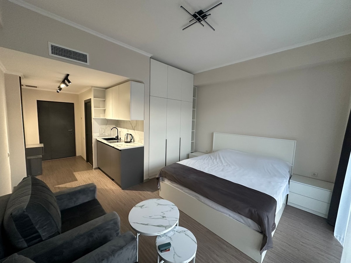 A cozy studio apartment, with all amenities - comfortable queen size bed, well equipped kitchen, folding sofa. Best for 2 adults and 2 kids, or 3 adults. Has a central heating and cooling. French balcony. There is a pool and a saunas in the first floor of the building.