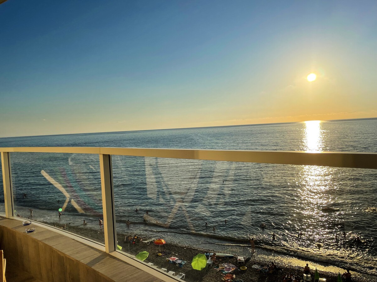 3 room apartment with sea view right on the private beachside: 2 bedrooms, large living room, and large balcony. Air conditioning installed in all rooms (2 bedrooms and living room). Equipped with a refrigerator, washing machine, dishwashing machine, 4-burner stove, oven, TV, and everything necessary.
