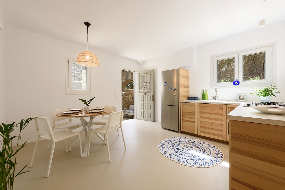 A traditionally renovated, neoclassical building, situated in a traditional square in the Cycladic village of Marpissa. Enjoy your holiday living in a quiet neighborhood, wander around whitewashed alleys, visit traditional tavernas, and folklore museums. Conveniently located in the center of the village and within walking distance from the market street and the crystal clear water beaches of Piso Livadi and Logaras.